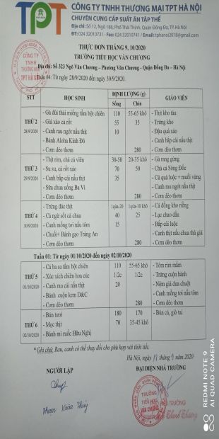 THỰC ĐƠN ĂN BÁN TRÚ - THÁNG 9 - TRƯỜNG TIỂU HỌC VĂN CHƯƠNG