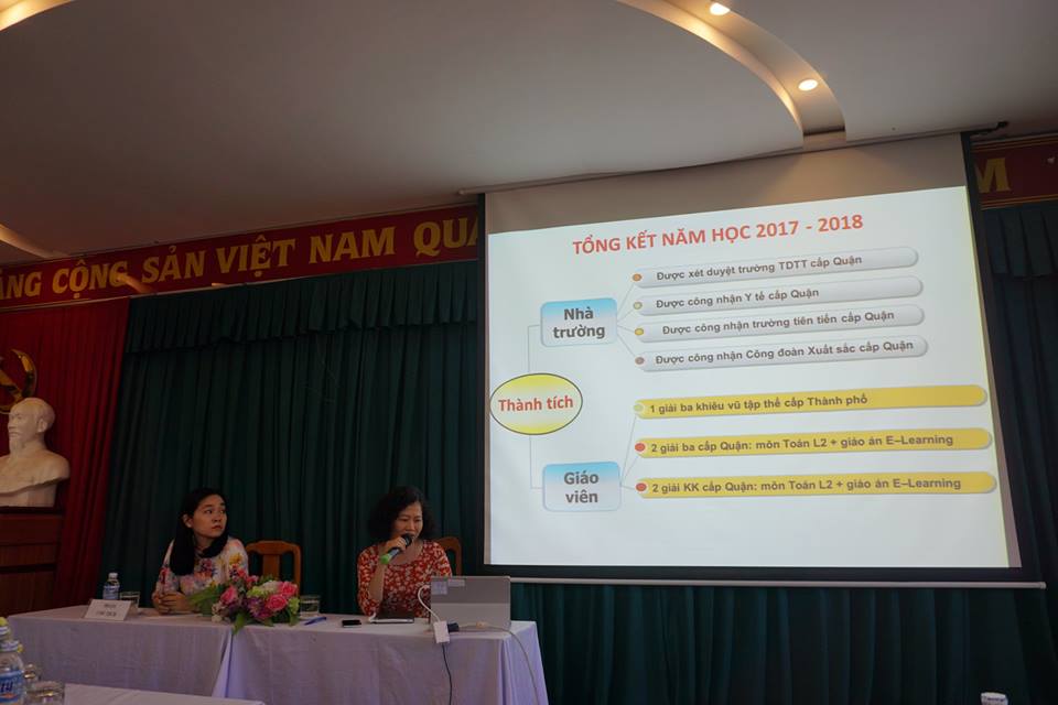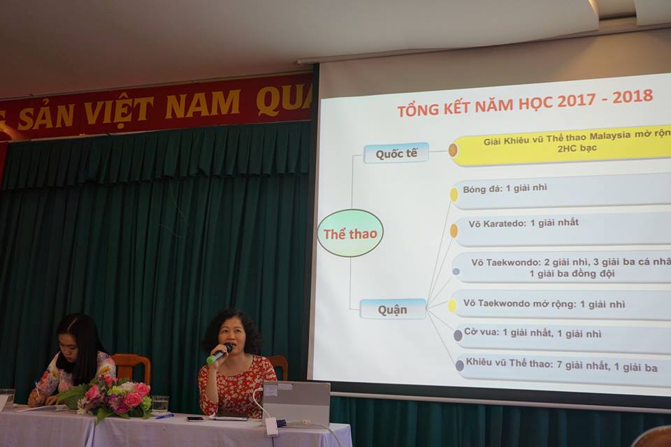 Đ/c hiệu trưởng Đỗ Ngọc Huệ lên báo cáo tổng kết năm học 2017 - 2018 và phương hướng năm 2018 - 2019
