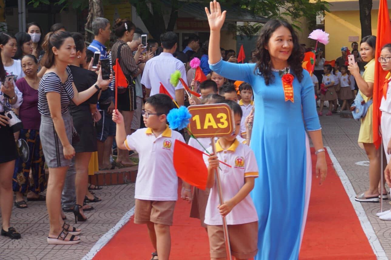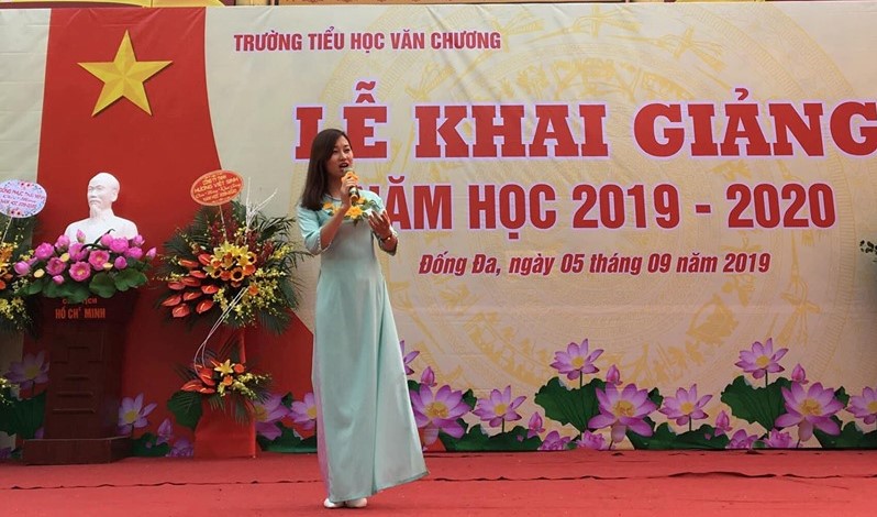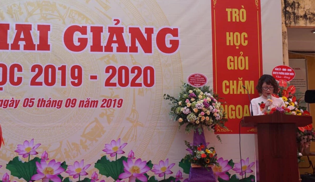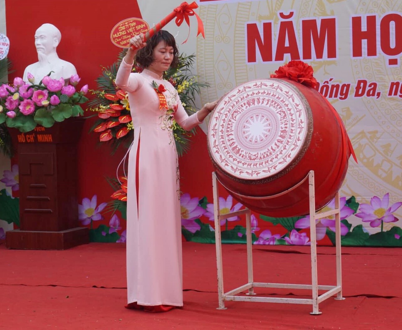 Cô Hiệu trưởng Hoàng Thúy Nga lên phát biểu và đánh tiếng trống trường chào đón năm học mới