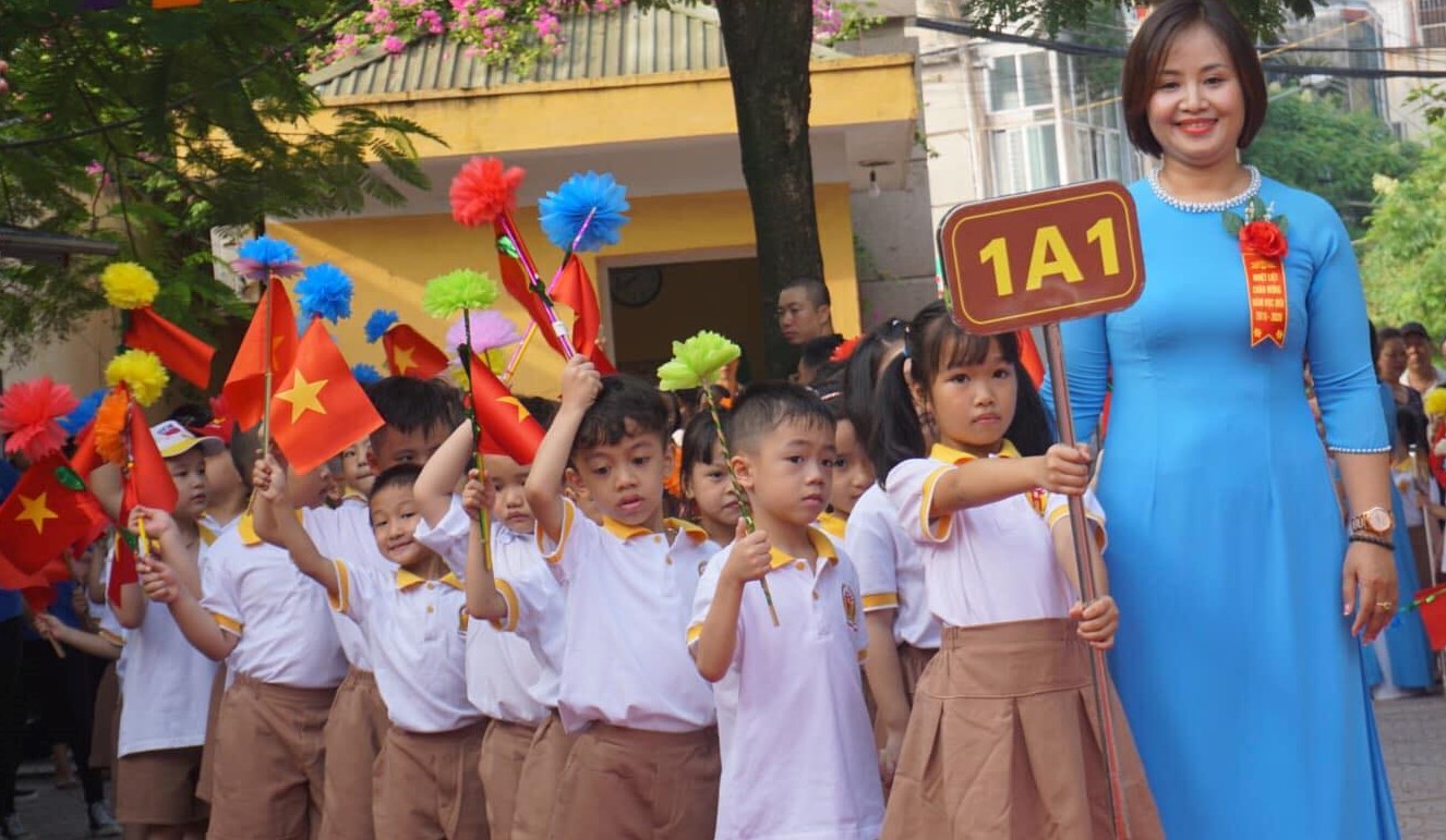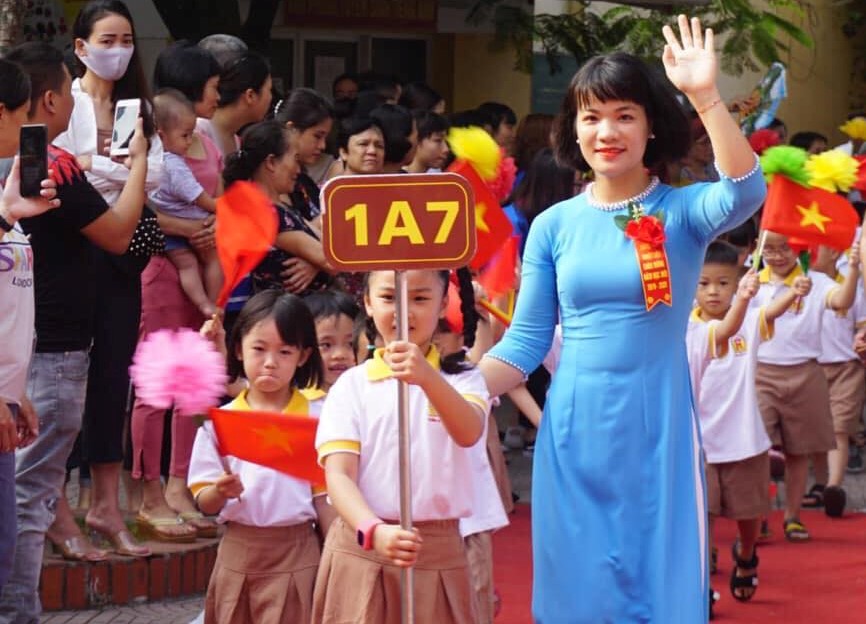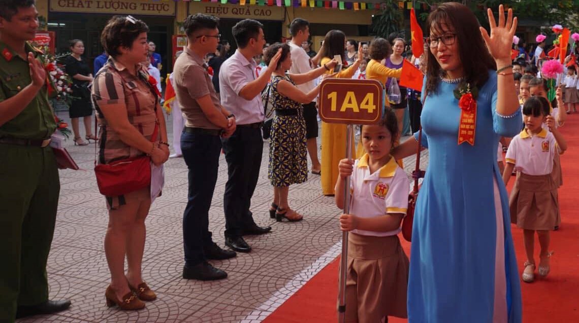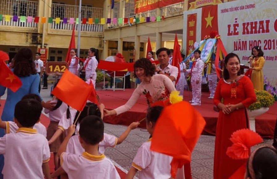 Cô Hiệu trưởng Hoàng Thúy Nga lên phát biểu và đánh tiếng trống trường chào đón năm học mới