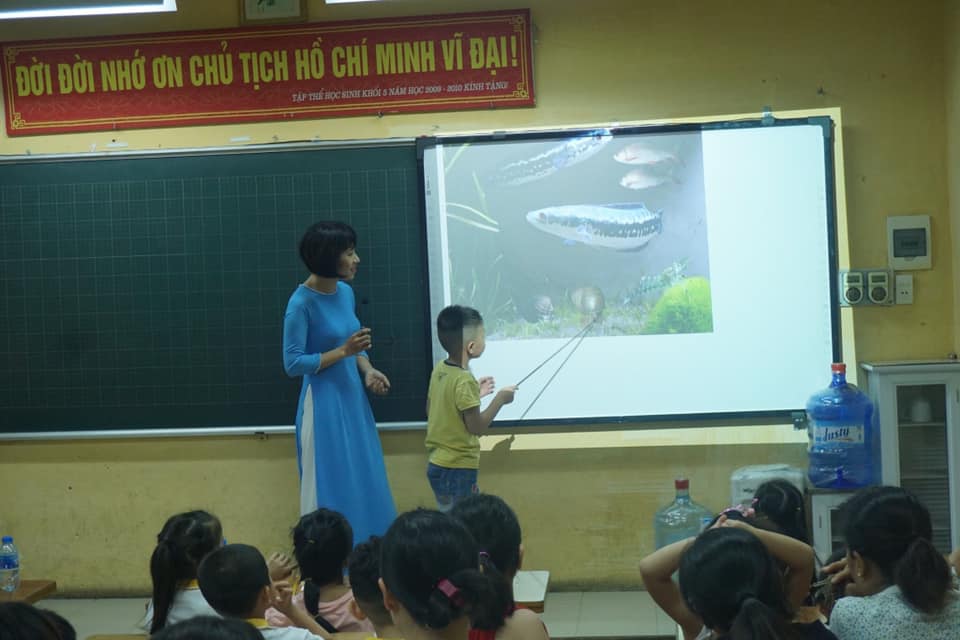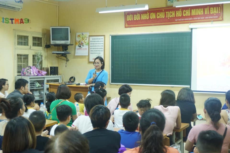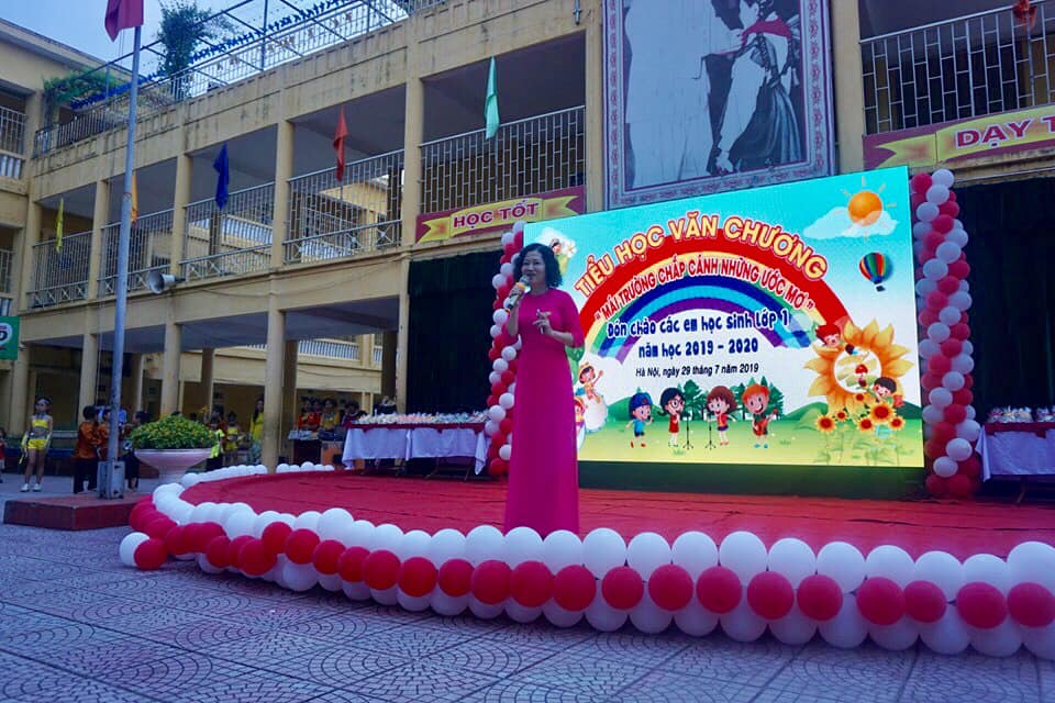 Cô hiệu trưởng lên phát biểu, giao lưu với các bạn HS lớp 1