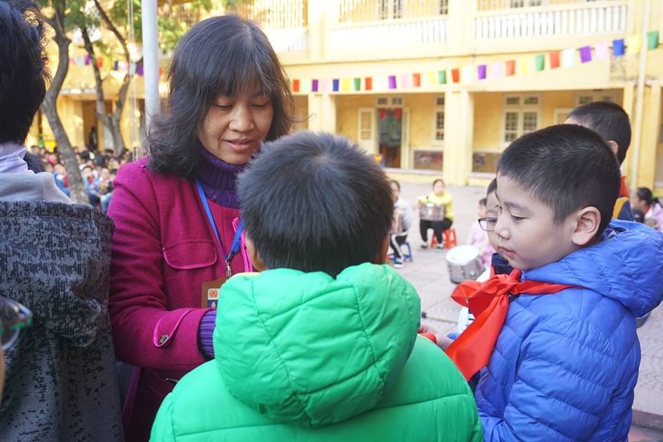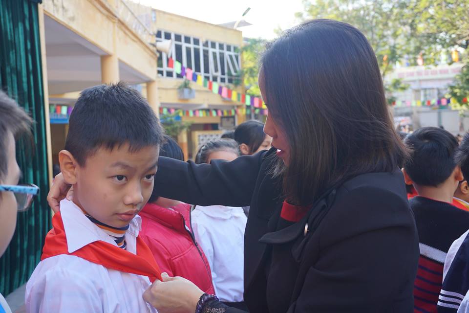 Cô hiệu trưởng lên trao cờ thi đua cho các lớp đạt xuất sắc tuần vừa qua