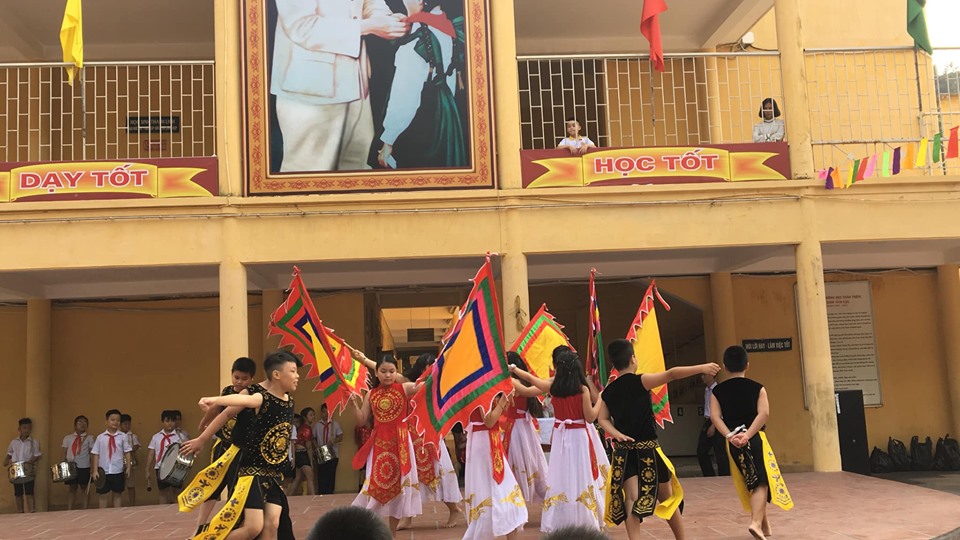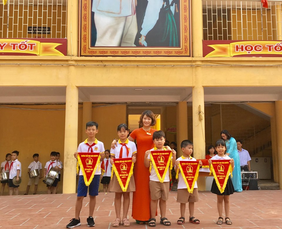 Cô Hiệu trưởng Hoàng Thúy Nga lên trao cờ thi đua cho các lớp đạt xuất sắc trong tuần qua