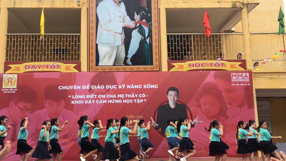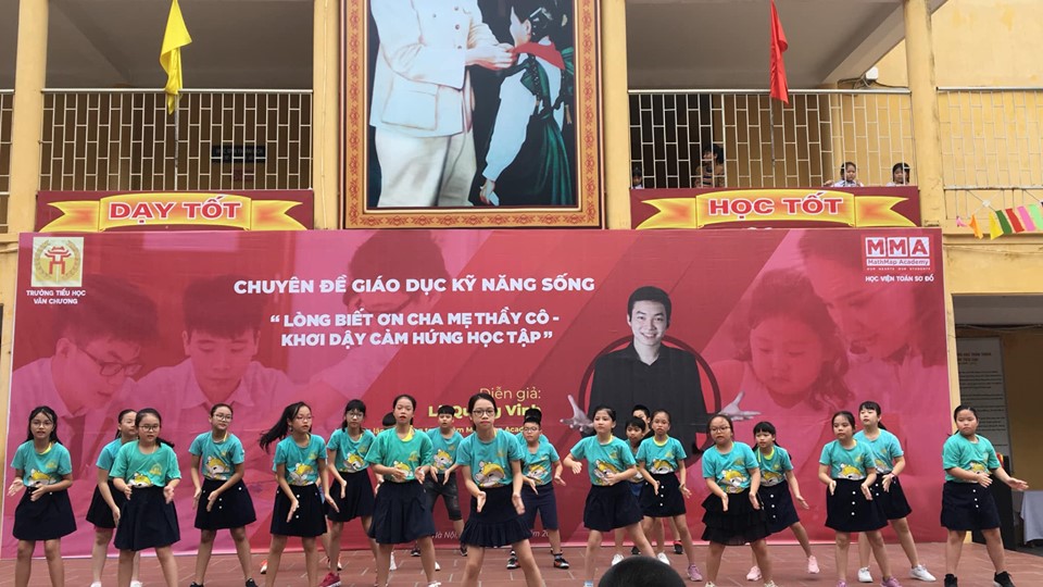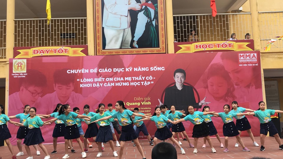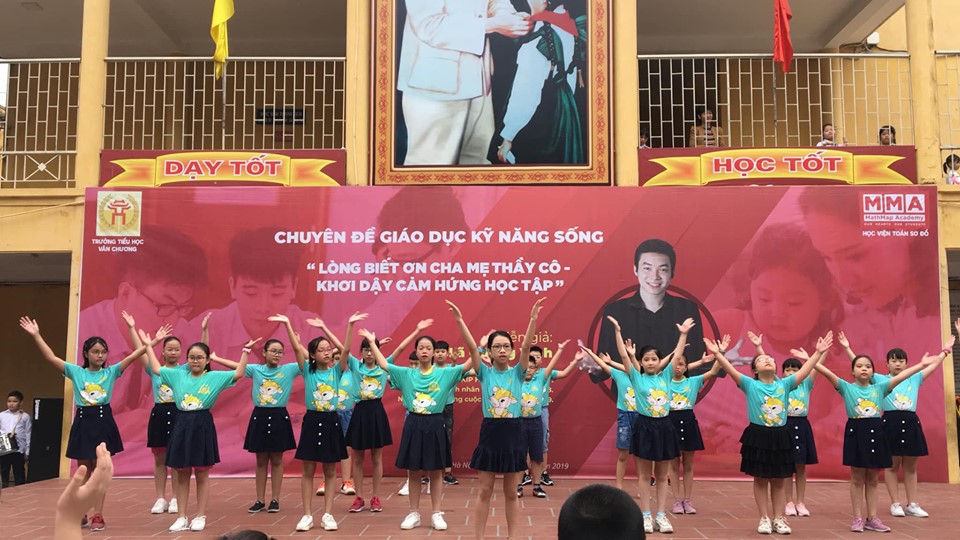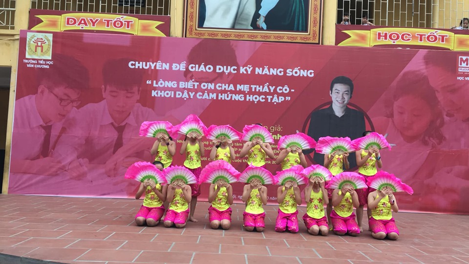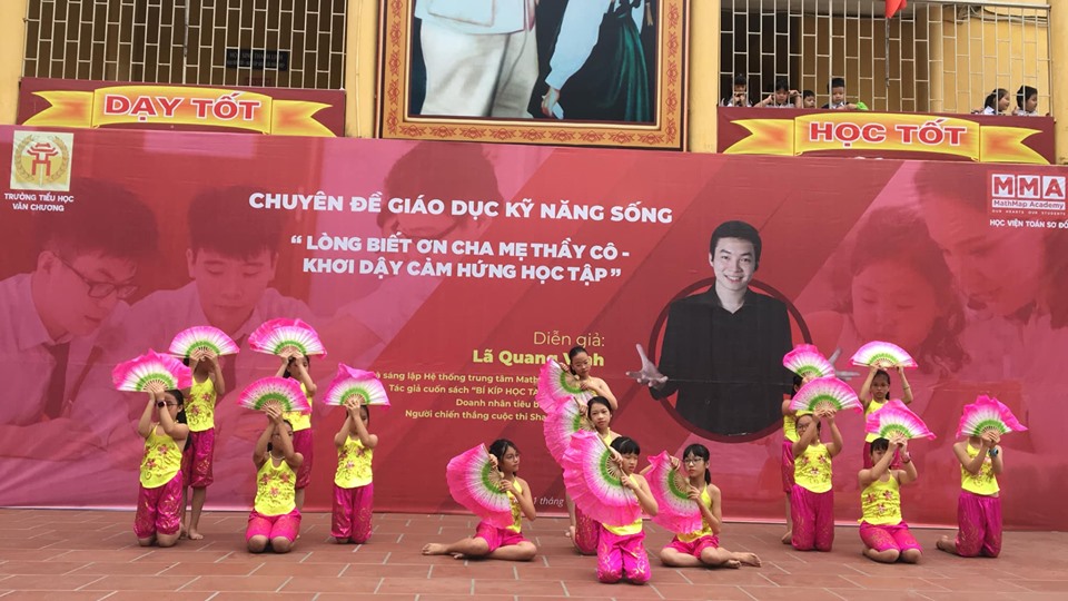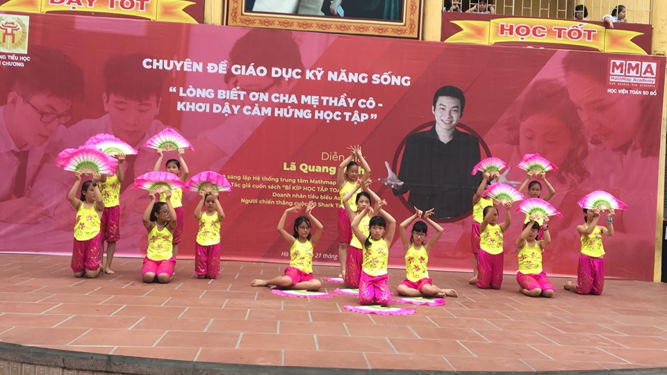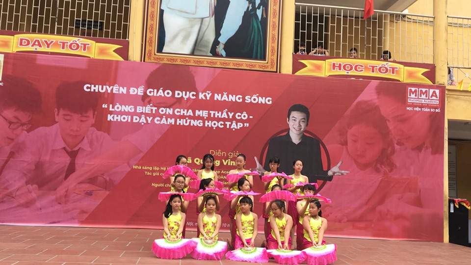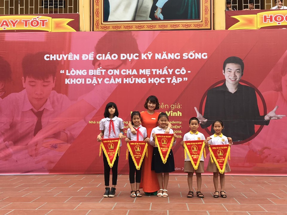 Cô Hiệu trưởng Hoàng Thúy Nga lên trao cờ thi đua cho các lớp đạt xuất sắc tuần vừa qua